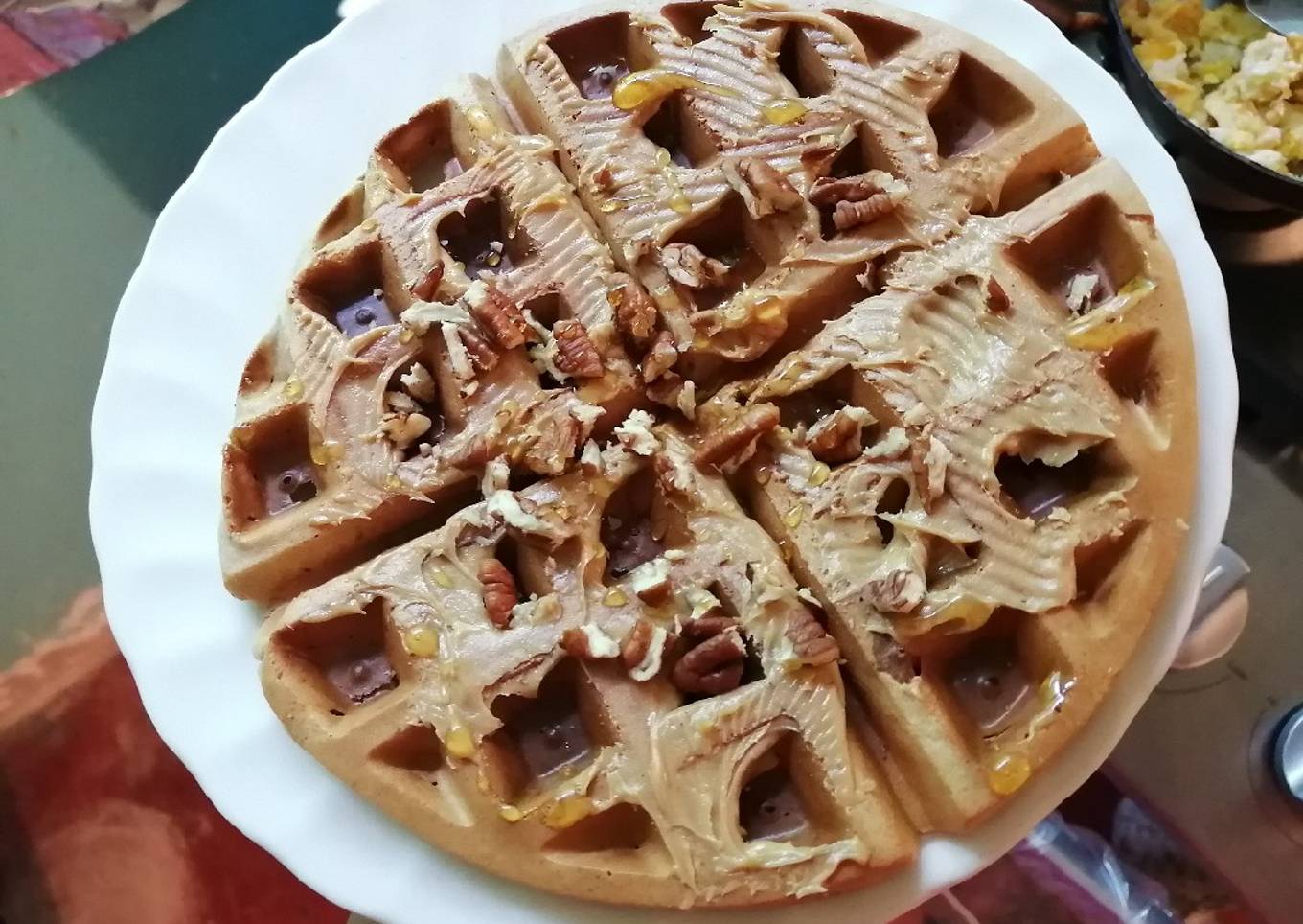 - Ya que están listos, unta crema de cacahuate, nuez y un poquito de miel y listo disfruta. A mí me salieron 4 waffles.