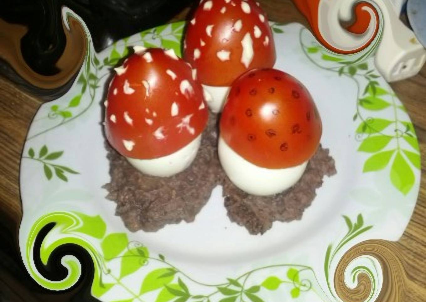 - Coloca los huevos sobre la parte plana y ponles la capucha de jitomate.