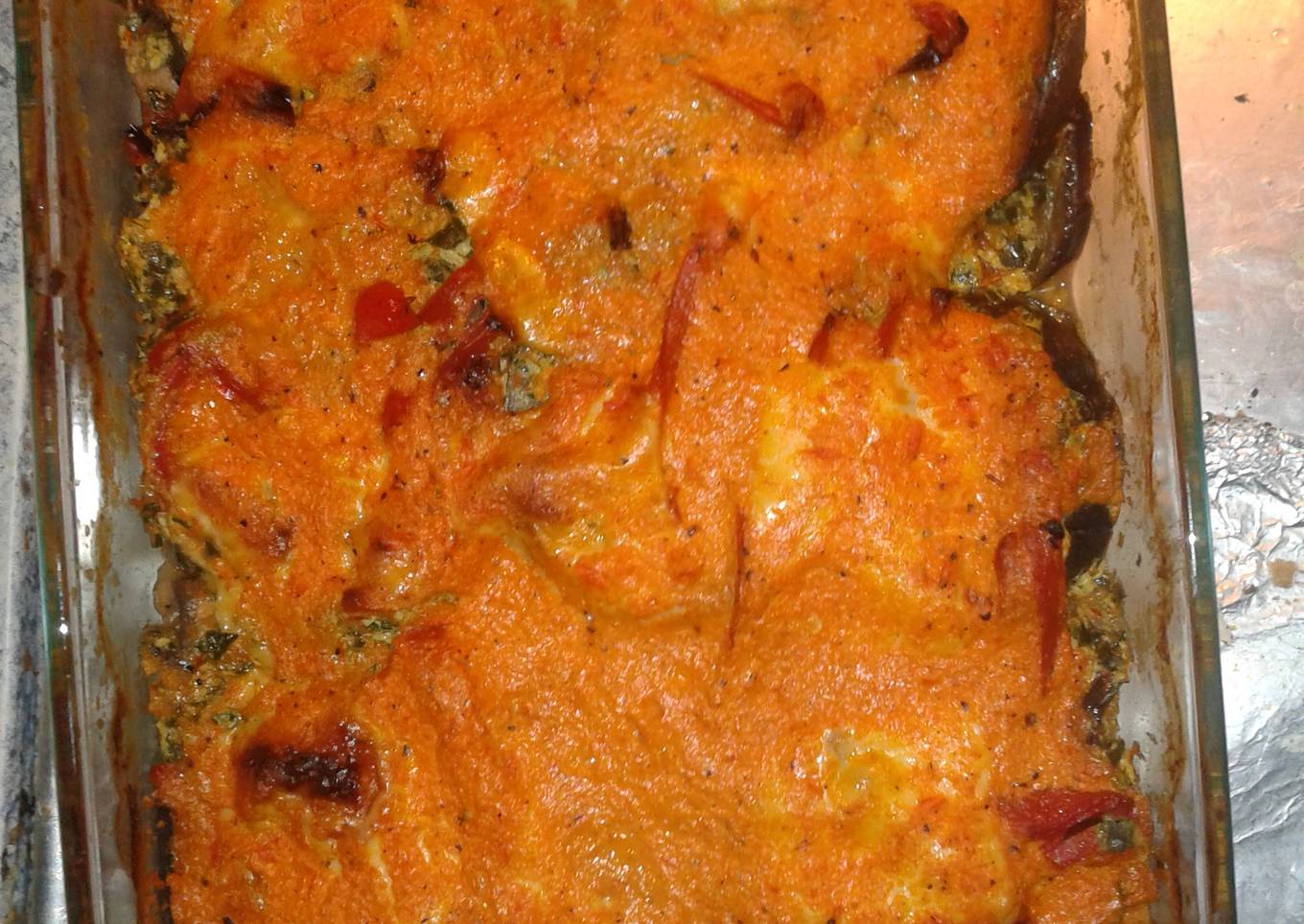 - Mientras tanto en una cacerola pones los champiñones con la cebolla y 1 ajo bien picado ya que tengas el guiso, corta los pimientos en julianas. y empieza a poner en un refractario una capa de berenjenas, después pones el queso junto con la espinaca y pones los pimientos, después pones otra capa de berenjenas pones los champiñones lo que te quedo de julianas y lo que te quedo de queso con espinaca todo bien esparcido, por ultimo viertes la salsa de pimiento y el queso panela, ya por ultimo la vuelves a meter al horno a unos 200 grados y esperas a que el queso se dore un poco y listo ya tienes tu lasagna de verduras.