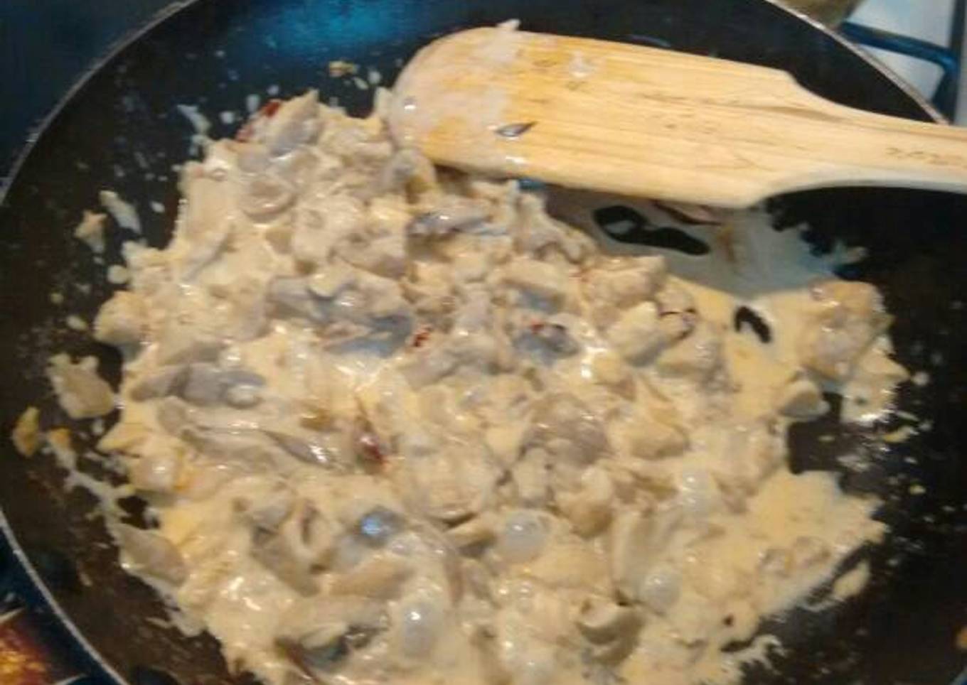 - Agrega los champiñones, baja el fuego y mezcla, guisa por unos 10 minutos. Agrega la crema, mezcla muy bien, después el queso y mezcla para que todo se sazone.