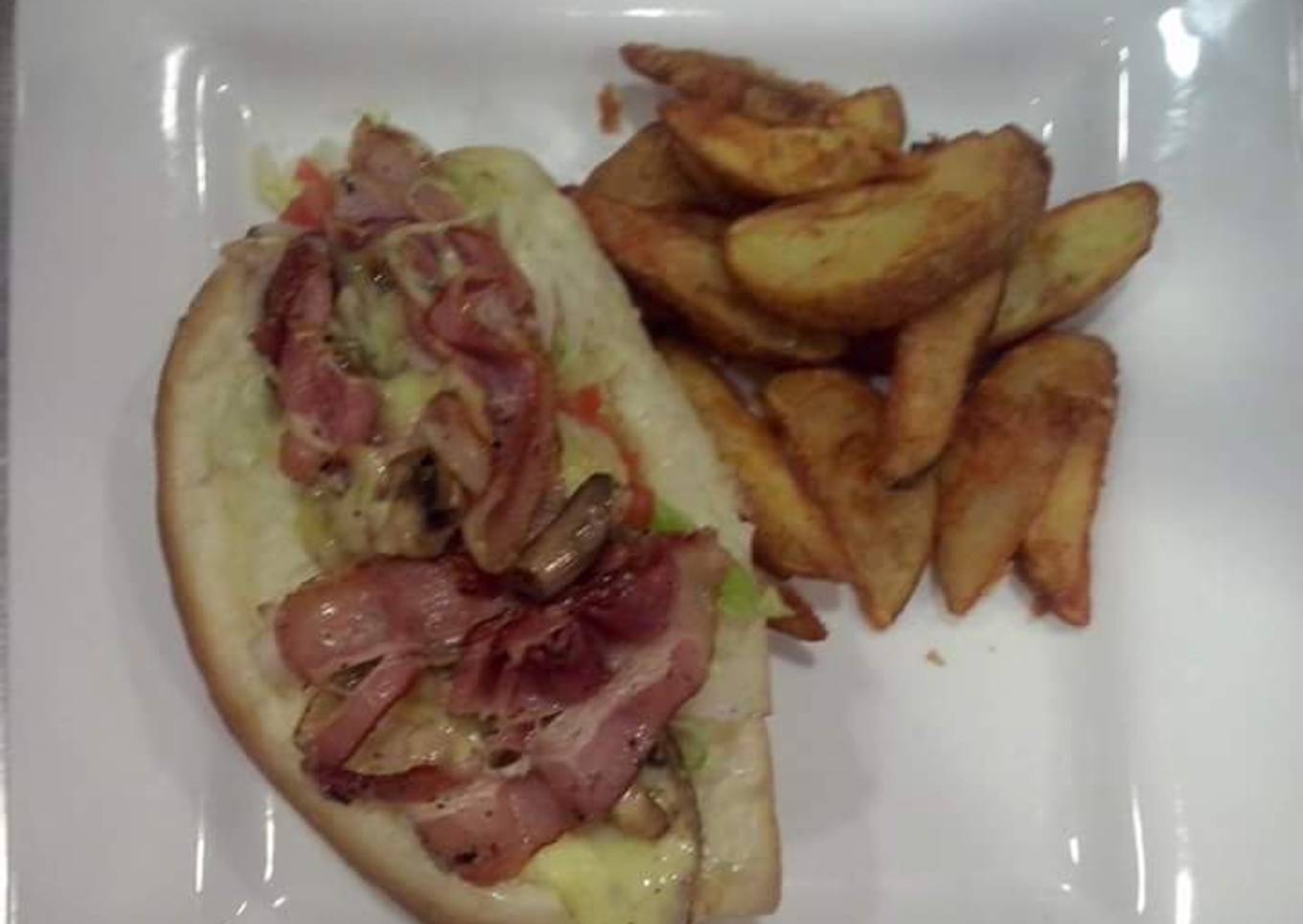 - Por último, se abre el pan se le unta mayonesa, se pone la salchicha, el tomate picado, cuando esté listo esto el guisado de la cebolla y el champiñón se ponen en un sartén y se le monta el queso rallado a que se gratine, ya gratinado se le monta al hot dog y se le tiran 3 tiras del tocino frito, se monta en un plato grande y por un lado las papas adobadas. Acompañado del aderezo de chipotle, catsup, mayonesa y chiles en escabeche.