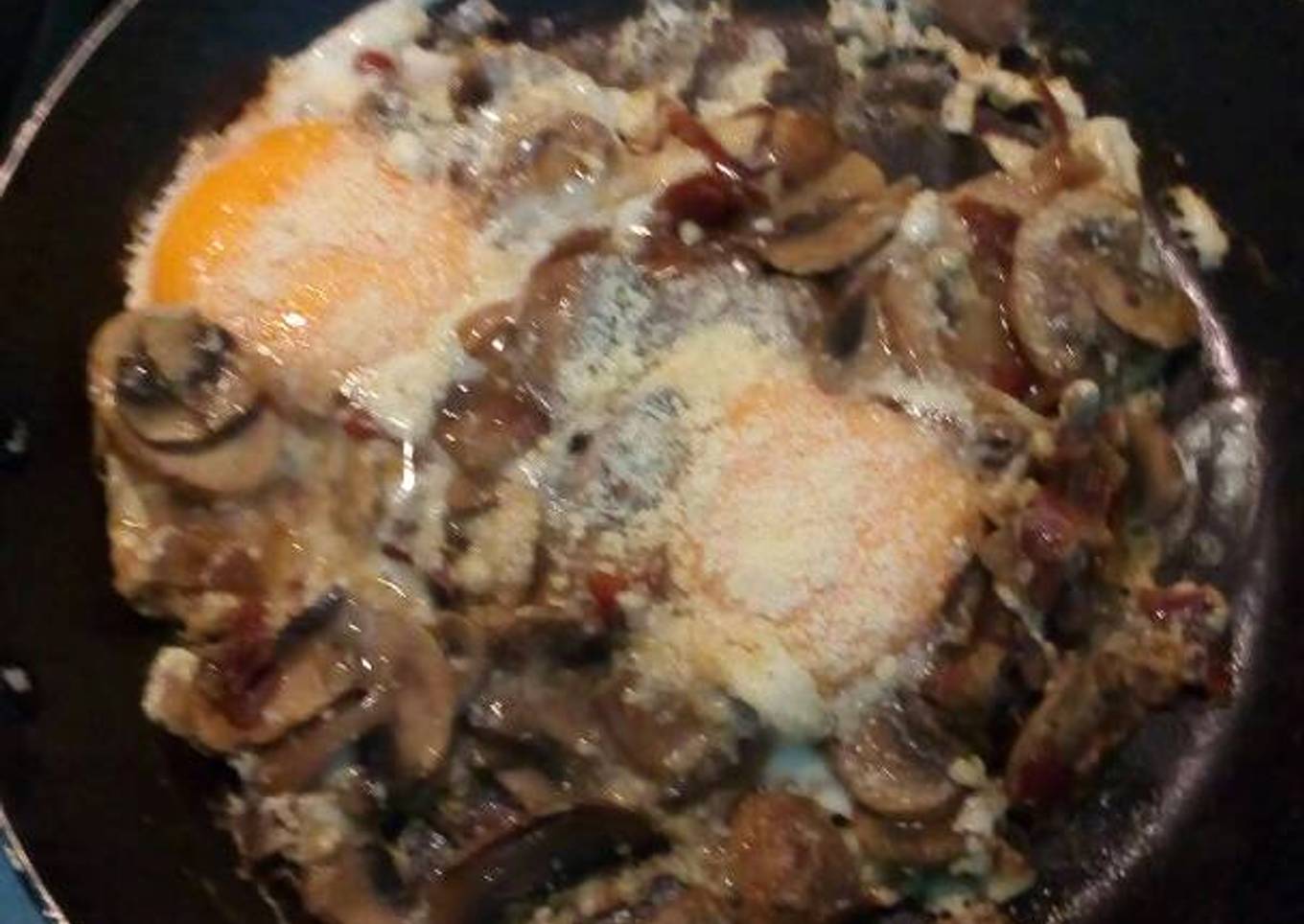 Huevos fritos con champiñones al ajillo y queso parmesano