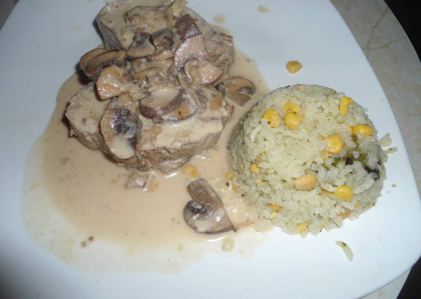 Lomo de cerdo preparado con una salsa de hongos mixtos y crema, delicioso.