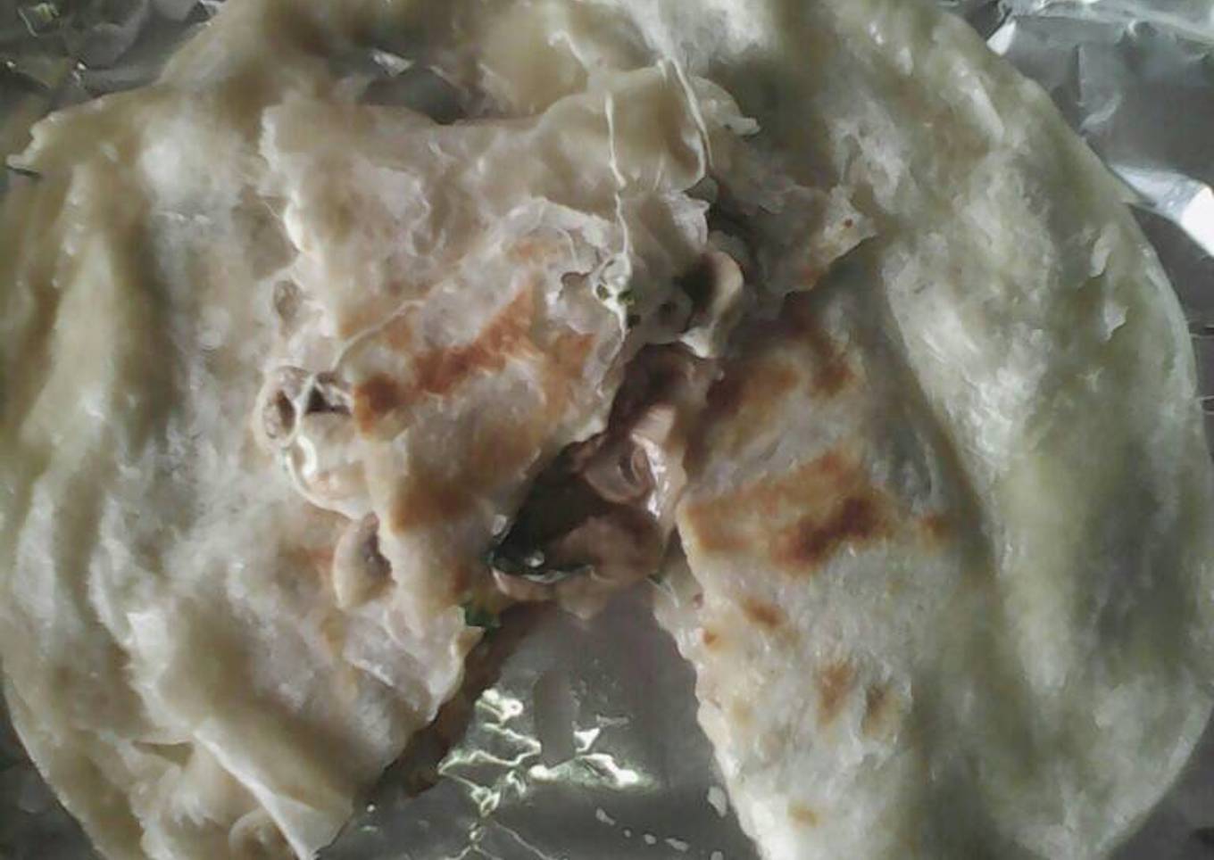 - Colocar una tortilla de harina en la hoja de aluminio y agregar un tanto de champiñones picados, cebolla, bastante queso, epazote y chile y sazonar con sal y colocar otra tortilla encima. Cerrar y sellar las orillas del aluminio.