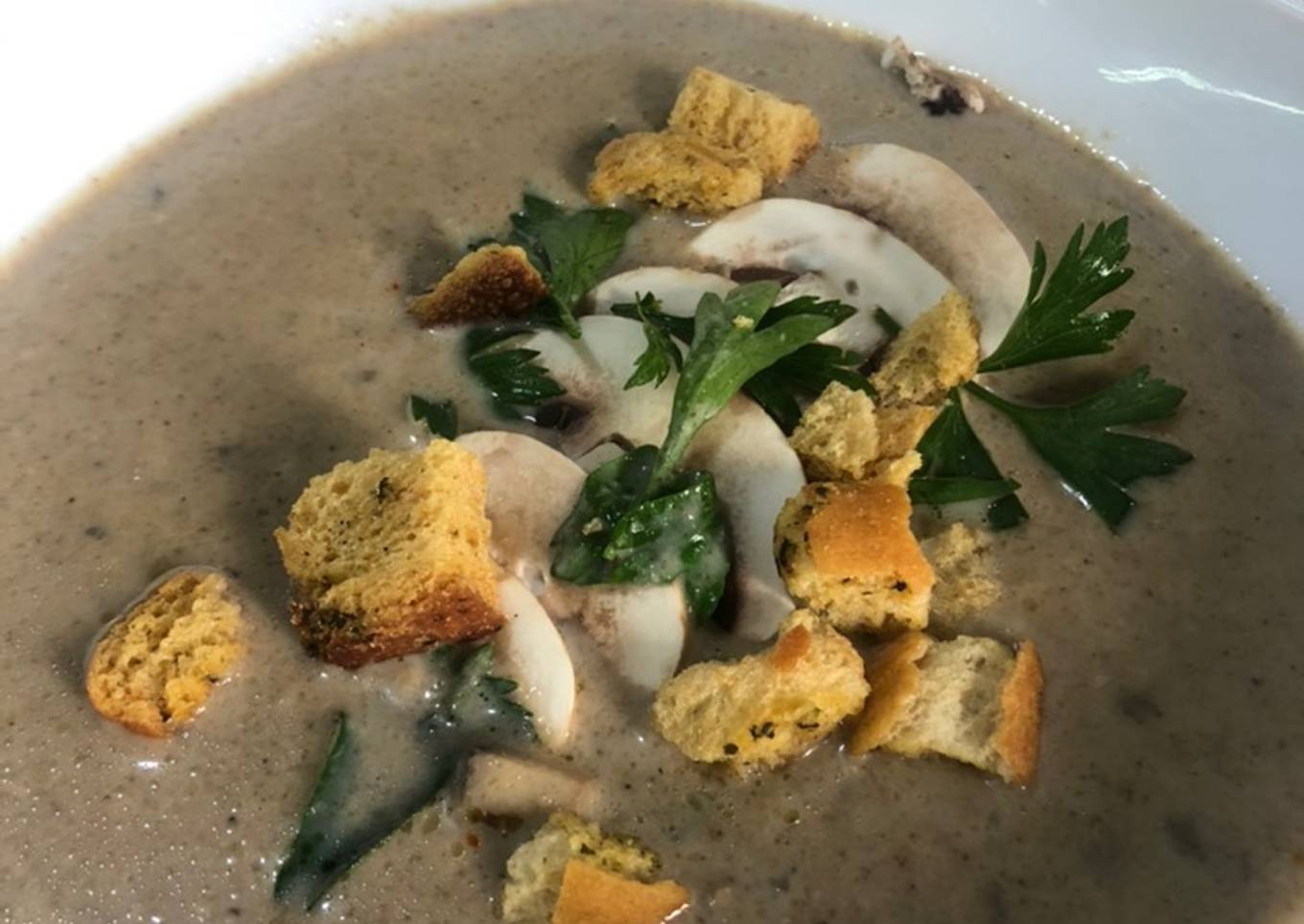 - Decoramos con las rodajas de champiñones crudos y el perejil listo buen provecho y crotones si lo prefiere