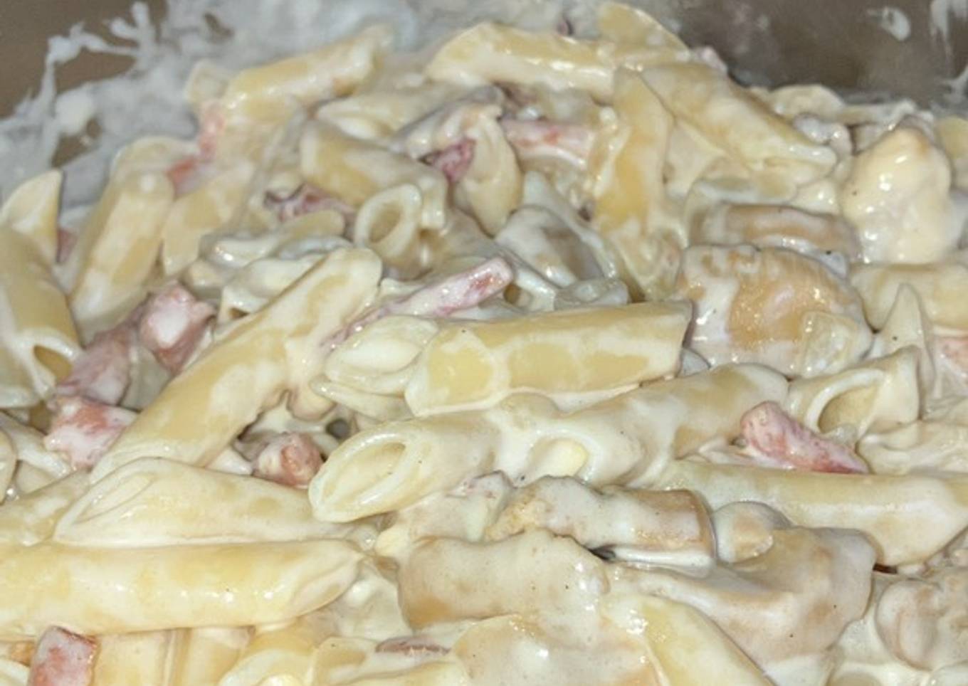 Macarrones con nata, bacon, queso y champiñones