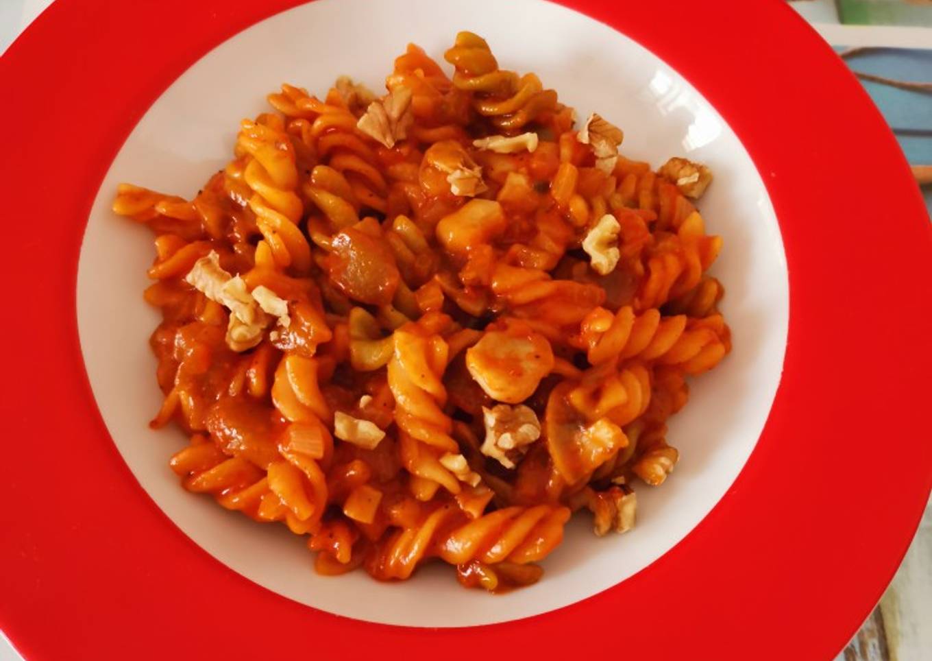 Espirales con berenjenas, nueces y champiñones