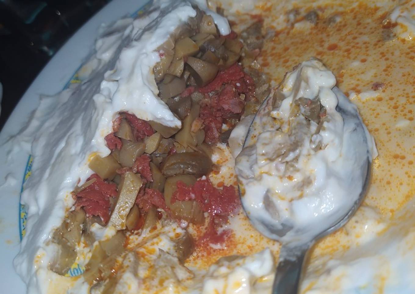 - En mi otra receta está, está mayonesa casera pues también se la Eché, la Eché por debajo primero y después puse todo el combinado en el relleno de la mayonesa y después le Eché una capa de mayonesa.