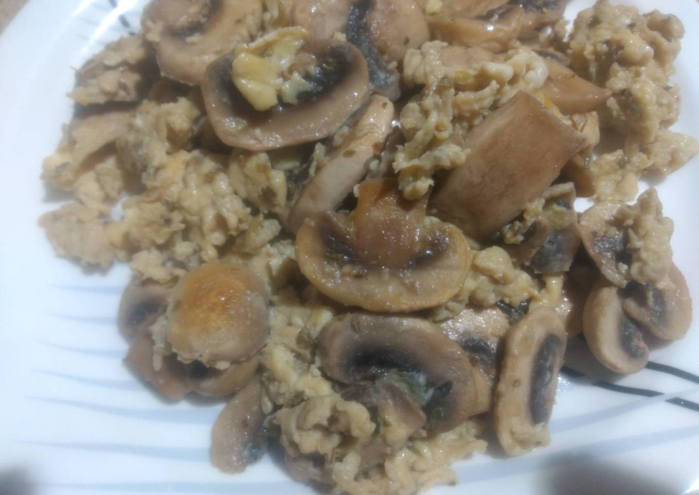 - Cuando estén los champiñones añadimos los huevos batidos, y revolvemos hasta que los huevos se cuajen, cuando ya estén espolvoreamos otro poco de orégano, revolvemos un poco y listo.