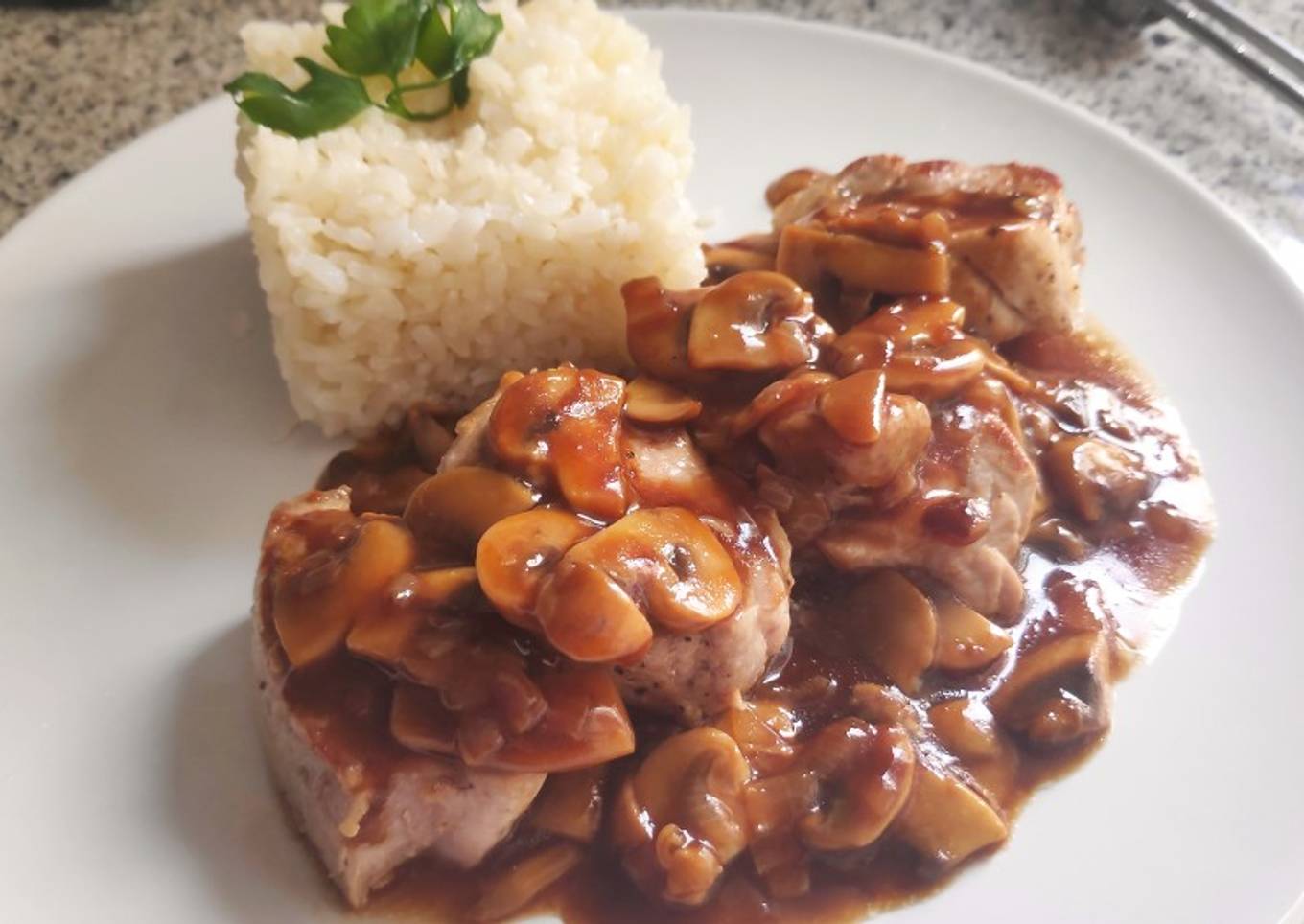 Solomillo con salsa de carne y champiñones y arroz