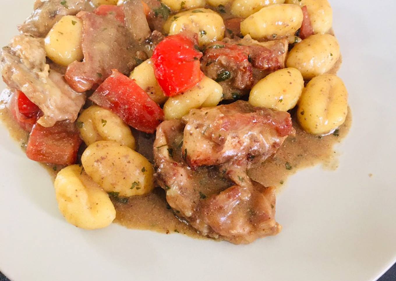 Ñoquis con conejo y salsa de champiñones