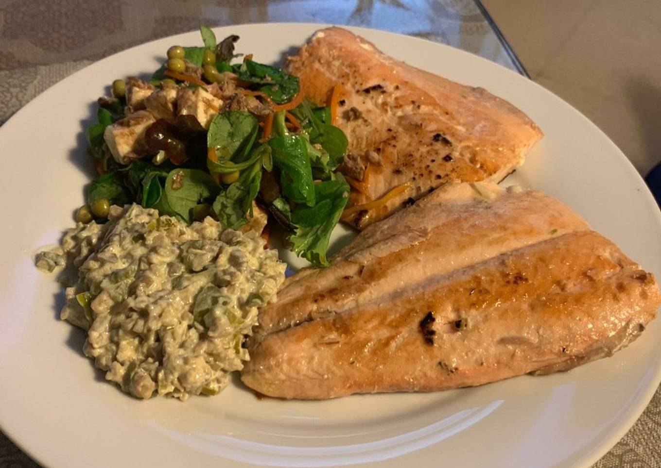 Salmón con guarnición de ensalada y salsa de champiñones