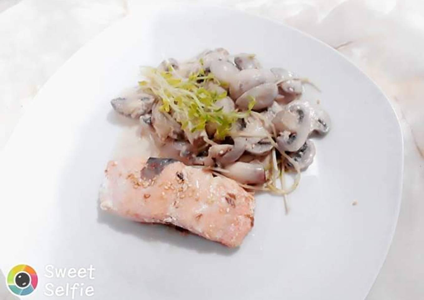 - Sazonamos nuestro salm贸n con sal ajo pimienta y unas gotas de lim贸n y dejamos reposar unos minutos..por mientras harmamos nuestros champi帽ones los ponemos laminados en una olla peque帽a con un poco de mantequilla sal y salteamos unos segundos agregamos el tarro de crema revolvemos y cocinamos por unos 2 minutos m谩s y apagamos....